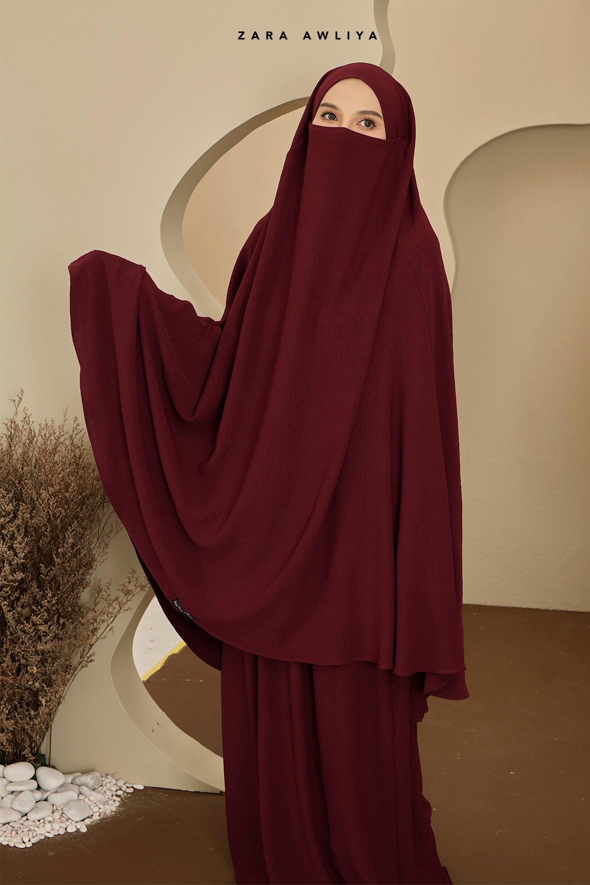 A Khimar Trisya offers versatile styling options, allowing it to be worn in three distinct ways: tied inside, tied on the outside, or draped in the purdah style. This comfortable garment is made from a high-quality and breathable Italian crepe which is known for its cooling effect. You can also wear it in a headless style, perfect for on-the-go prayers without needing to remove your hijab.